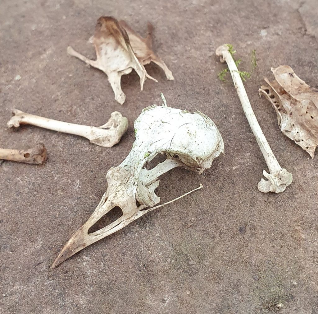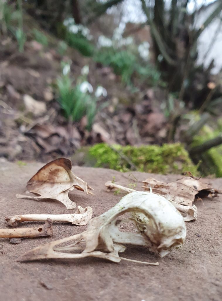 Diese Knochen habe ich in meinem Garten gefunden. Sie lagen dort schon ziemlich lange unbemerkt und die Geschichten, die ich um sie herum spinne sind reine Spekulation. Trotzdem habe ich mich ganz besonders gefreut, sie zu finden. Ich lege nämlich gerade einen neuen Gemüsegarten an und dafür musste natürlich ein Stück wilder Garten weichen. Außerdem mussten wir auf dem selben Grundstück einen sehr alten, großen, mit Efeu bewachsenen Apfelbaum kappen, da die morschen Äste auf die Straße zu fallen drohten. Mein schlechtes Gewissen war groß, wusste ich doch genau, dass dieser Baum ein beliebter Sitzplatz für Eichelhäher und Tauben war und die Amseln gerne ihre Wächter dort platzierten. Das eine oder andere alte Nest fand sich im Efeu auch. Den (Eichelhäher?)Schädel habe ich beim Freischneiden meiner geplanten Beetfläche entdeckt. Ein Geschenk. Eine Erinnerung daran, dass man, wenn man etwas nimmt, auch immer etwas geben sollte. Und mit den Geschichten, die ich mir um diese letzten Spuren herum ausdenke, wachsen auch die Ideen, wie ich einen Ausgleich schaffen werde. Schließlich bin ich nicht die Einzige, die hier lebt und Andere waren definitiv schon vor mir da.