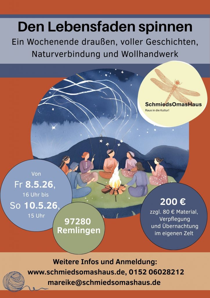 Genauso spinnen wir die ein oder andere erzählte Geschichte vielleicht abends am Feuer weiter, verweben sie mit unseren Eindrücken und Erlebnissen und verknüpfen sie zu gemeinsamen schönen Erinnerungen. Wir nutzen das, was uns umgibt als Inspiration, als Material, als Nahrung. So entsteht ein Netzwerk unserer Lebensfäden, das uns über den Kurs hinaus verbindet, nicht nur mit den anderen Teilnehmer:innen, sondern auch mit der Natur, dem Platz und den dort lebenden Pflanzen und Tieren. Wir spinnen den Lebensfaden und weben daraus das Netzwerk des Lebens.